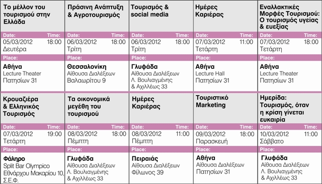 Μεταξύ των σεμιναρίων που θα λάβουν χώρα σε Αθήνα, Πειραιά, Ν. Φάληρο, Γλυφάδα και Θεσσαλονίκη θα είναι τα εξής: «Πράσινη Ανάπτυξη και Αγροτουρισμός», «Τουρισμός και social media», «Κρουαζιέρα και Ελληνικός Τουρισμός», «Τουριστικό Marketing», «Εναλλακτικές Μορφές Τουρισμού: Ο τουρισμός υγείας και ευεξίας».