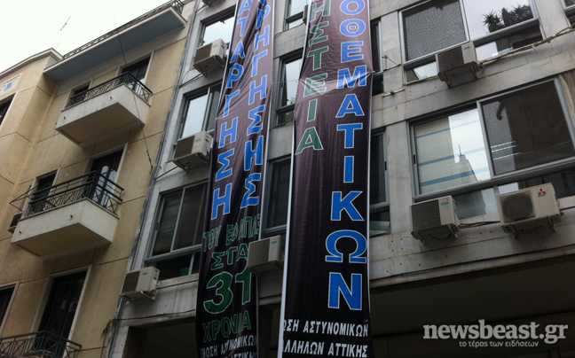 Συμβολική κατάληψη πραγματοποιούν από νωρίς το πρωί συνδικαλιστές αστυνομικοί έξω από το ταμείο τους (ΤΕΑΠΑΣΑ), που βρίσκεται στην οδό Βερανζέρου 48 στην Ομόνοια.