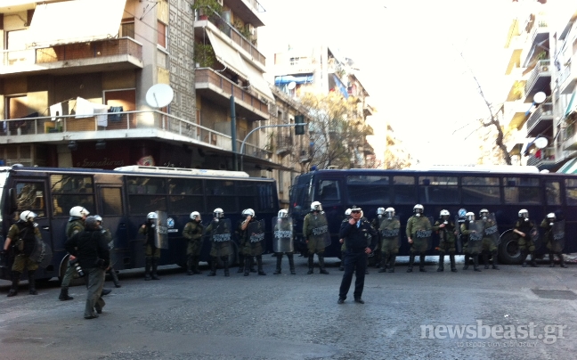 Κλούβες της αστυνομίας έχουν παραταχθεί κάθετα στο δρόμο της οδού Αχαρνών, δημιουργώντας μπλόκο, με σκοπό να ανακόψουν την διαδρομή της διαδήλωσης. Σημειώνεται ότι σε «απάντηση» της σημερινής πορείας, η Χρυσή Αυγή και ακροδεξιές ομάδες ετοιμάζουν αντισυγκέντρωση στην περιοχή του Αγίου Παντελεήμονα.