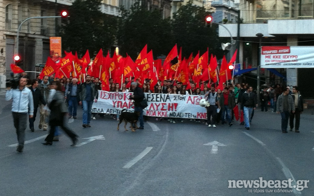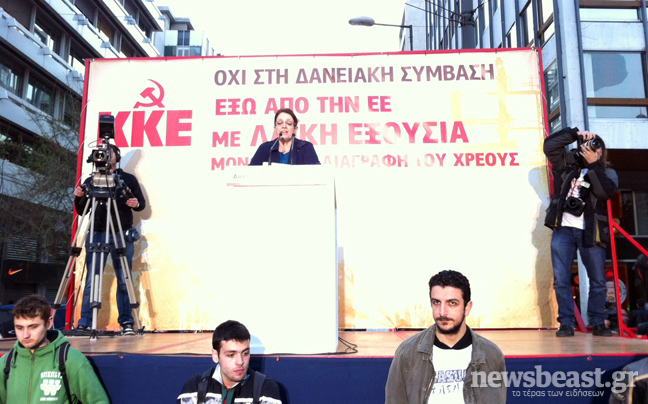 Πριν από λίγα λεπτά ξεκίνησε η ομιλία της Γενικής Γραμματέως της Κεντρικής Επιτροπής του ΚΚΕ, Αλέκας Παπαρήγα, στην πλατεία Συντάγματος, με τη συμμετοχή περίπου 10.000 συγκεντρωμένων, οι οποίοι διαδηλώνουν την αντίθεσή τους στη νέα δανειακή σύμβαση που υπέγραψε η χώρα.