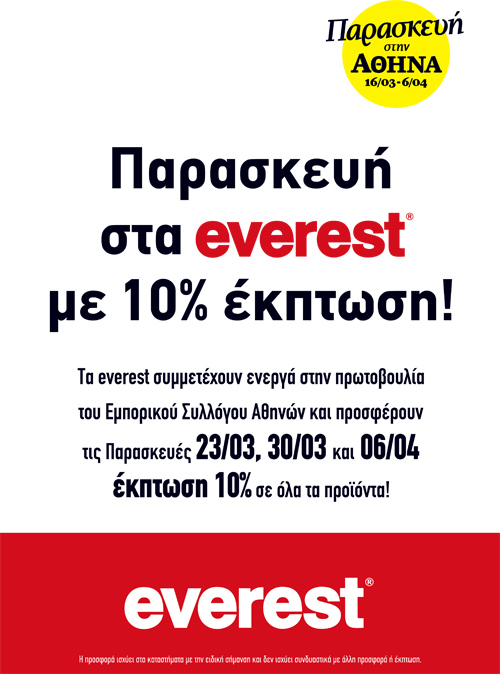 Αποδεικνύοντας έμπρακτα την συμβολή του στην προσπάθεια αυτή, η everest θα συμμετέχει ενεργά στη δράση του Εμπορικού Συλλόγου Αθηνών προσφέροντας κάθε Παρασκευή από τις 23 Μαρτίου έως 6 Απριλίου, 10% έκπτωση σε όλους τους επισκέπτες στα καταστήματα everest στο κέντρο της Αθήνας (Σύνταγμα, Ομόνοια, Μοναστηράκι, Ακαδημίας, Σόλωνος & Σίνα και Σόλωνος & Χαρ. Τρικούπη). Αξίζει να σημειώσουμε ότι η παραπάνω έκπτωση θα ισχύει στο σύνολο των προϊόντων που διαθέτουν τα καταστήματα everest.