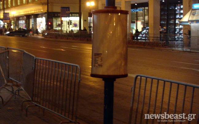 Όπως φανερώνουν οι φωτογραφίες, κάγκελα έχουν στηθεί κατά μήκος της Βασιλίσσης Αμαλίας και της Πανεπιστημίου. Από τα κιγκλιδώματα δεν «γλιτώνουν» ούτε οι θάμνοι, ούτε οι στάσεις των λεωφορείων αλλά ούτε και τα περίπτερα.