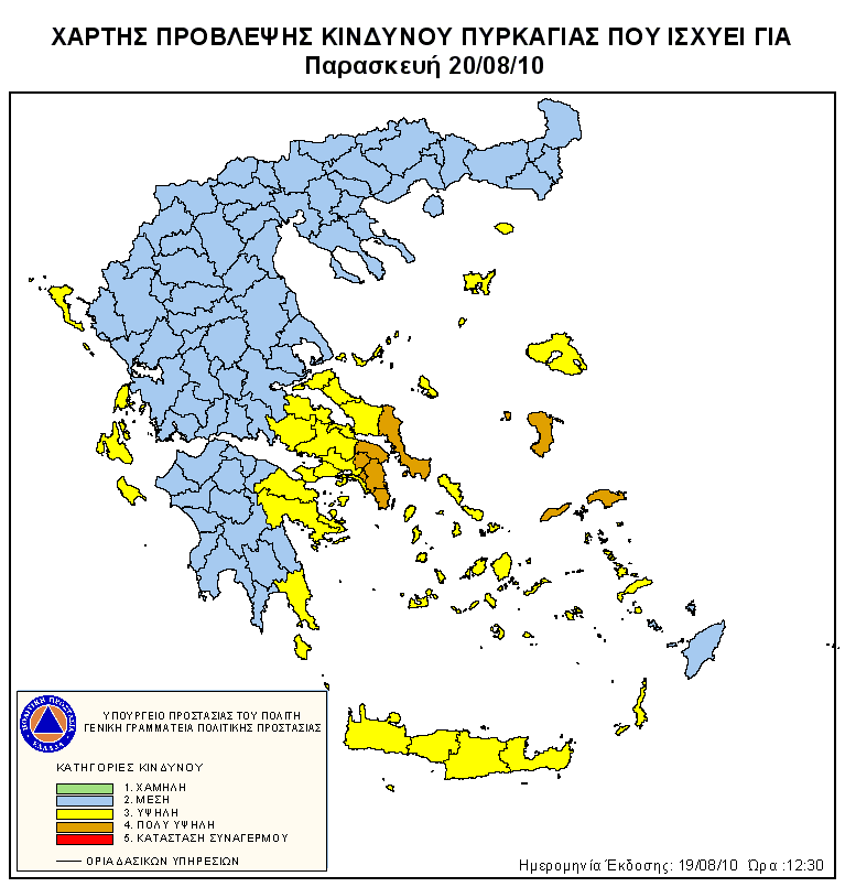 Υψηλός κίνδυνος να εκδηλωθεί πυρκαγιά υπάρχει σήμερα σε Αθήνα, Ανατολική Αττική, Εύβοια, Σάμο και Χίο. Η Γενική Γραμματεία Πολιτικής Προστασίας έχει ενημερώσει τις κρατικές υπηρεσίες και τους Οργανισμούς Τοπικής και Νομαρχιακής Αυτοδιοίκησης των παραπάνω περιοχών, ώστε να βρίσκονται σε αυξημένη ετοιμότητα προκειμένου να αντιμετωπίσουν άμεσα τυχόν επεισόδια πυρκαγιών.