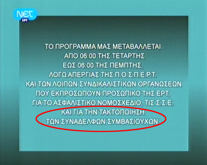 Είμαι ένας ταλαίπωρος Έλληνας πολίτης, που πληρώνω κανονικά τους φόρους μου, ζω με 750 ευρώ το μήνα και δεν… έχω κανένα βύσμα. Είμαι συμβασιούχος και τέλος του άλλου μήνα η σύμβασή μου ολοκληρώνεται. Επειδή ο Οργανισμός που εργάζομαι δεν έχει τη δυνατότητα παρέμβασης στα Media απευθύνω έκκληση στους εργαζόμενους στην ΕΡΤ να αλλάξουν το κείμενο που εμφανίζεται στους δέκτες της ΕΡΤ και να γράψουν, αντί για συναδέλφους συμβασιούχους, για όλους τους συμβασιούχους.