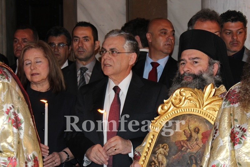 Στη λειτουργία της Ανάστασης παρέστησαν ο πρωθυπουργός Λουκάς Παπαδήμος και οι, Όλγα Κεφαλογιάννη, Γιώργος Κουτρουμάνης, Ιωάννης Τραγάκης και Άννα Διαμαντοπούλου.
