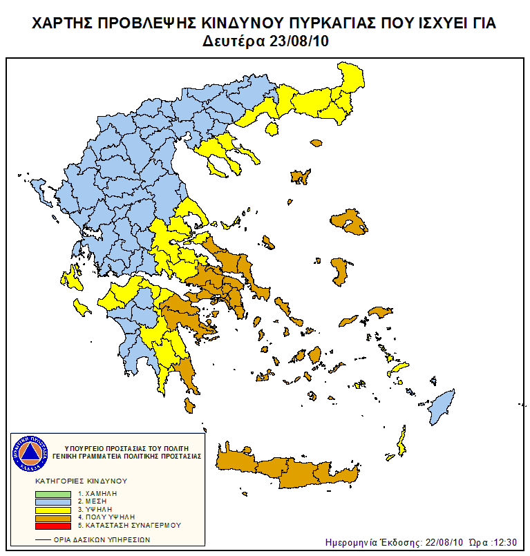 Σε αυξημένη ετοιμότητα βρίσκεται η Γενική Γραμματεία Πολιτικής Προστασίας, μιας και σήμερα υπάρχει ιδιαίτερα αυξημένος κίνδυνος (κατηγορία κινδύνου 4) να ξεσπάσει πυρκαγιά σε Αθήνα, Ανατολική Αττική, Δυτική Αττική, Πειραιά, Βοιωτία, Εύβοια, Αργολίδα, Κορινθία, Λακωνία, Λέσβο, Σάμο, Χίο, Κυκλάδες, Ηράκλειο, Λασίθι, Ρέθυμνο, Χανιά και Έβρο.