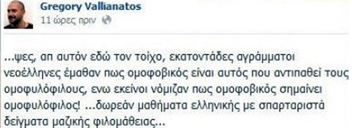 Συνεχίζει να προκαλεί ο Γρηγόρης Βαλλιανάτος στο facebook μετά το χαρακτηρισμό «ομοφοβικός» που έγραψε για το Δημήτρη Μητροπάνο.