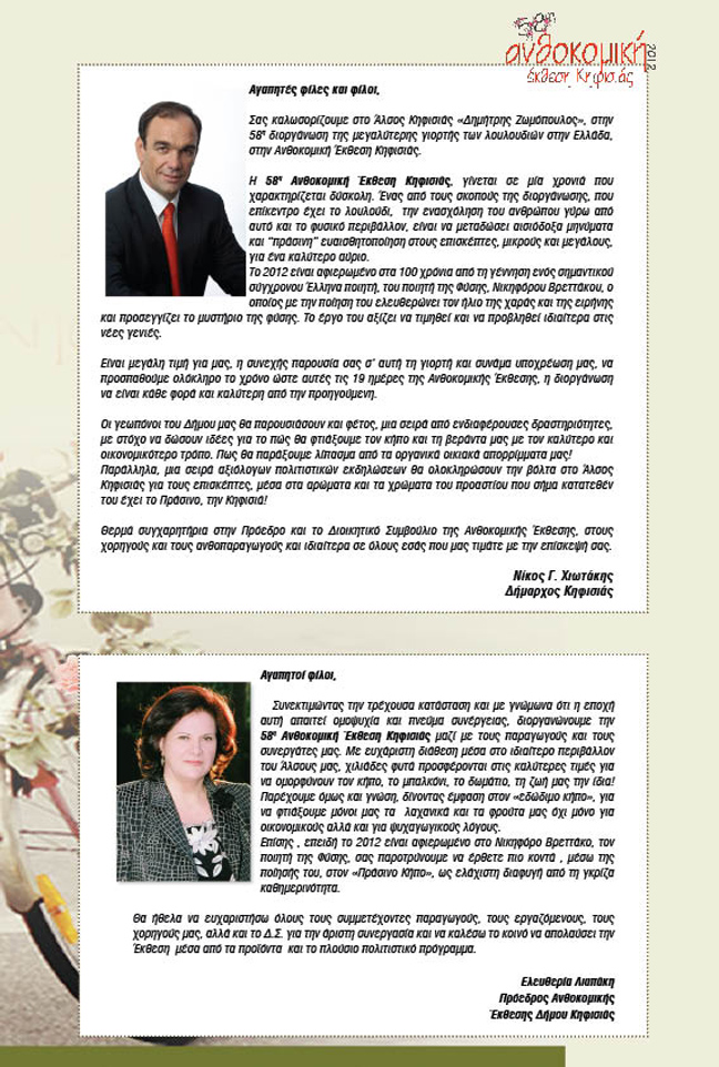 Ο Δήμαρχος Κηφισιάς κ. Νίκος Γ. Χιωτάκης, η Πρόεδρος κ. Ελευθερία Λιαπάκη και το Δ.Σ της Ανθοκομικής Έκθεσης Κηφισιάς θα παρουσιάσουν και φέτος στην 58η Ανθοκομική, μια σειρά από ενδιαφέρουσες δραστηριότητες, όπως καθιερώθηκαν τα τελευταία χρόνια.