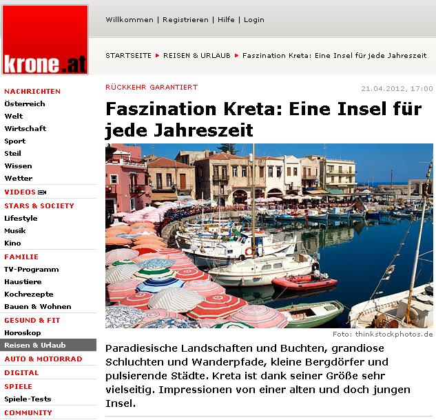 Η πολυμορφία και μαγεία της Κρήτης γοήτευσαν τη συντάκτρια μεγάλου τετρασέλιδου ταξιδιωτικού αφιερώματος στο νησί που φιλοξενεί η μεγαλύτερη σε κυκλοφορία αυστριακή εφημερίδα «Κρόνεν Τσάιτουνγκ», με τίτλο «Η μαγεία της Κρήτης- Ένα νησί για κάθε εποχή του έτους».