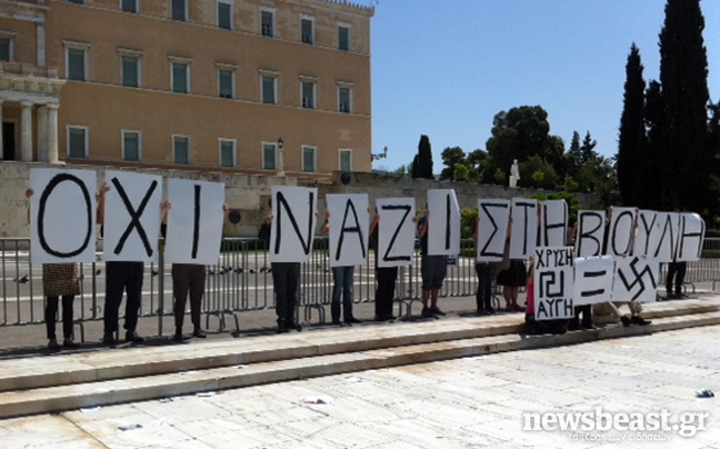 Κρατώντας πλακάτ όπου πάνω αναγράφεται «Όχι Ναζί στη Βουλή» πολίτες διαμαρτυρήθηκαν έξω από τη Βουλή για την άνοδο των ποσοστών της Χρυσής Αυγής στις προεκλογικές δημοσκοπήσεις.