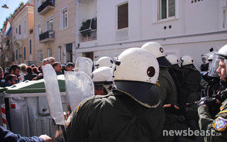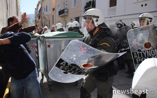 Νωρίτερα οι συγκεντρωμένοι κατήγγειλαν ότι τους χτύπησαν τα ΜΑΤ, όταν προσπάθησαν να περάσουν από τον φραγμό που είχε στήσει η αστυνομία μπροστά από το πρωθυπουργικό γραφείο.