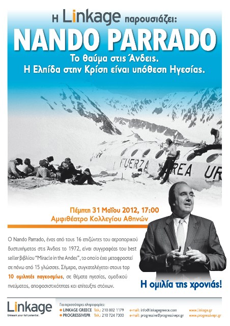Η Linkage Greece διοργανώνει την Πέμπτη 31 Μαΐου 2012 μια ξεχωριστή ομιλία, με επίσημο προσκεκλημένο το διακεκριμένο ομιλητή παγκοσμίως σε θέματα ηγεσίας, Nando Parrado, για μια συναρπαστική βιωματική αφήγηση. Ο κορυφαίος speaker, θα συναντήσει τους σπουδαιότερους ηγέτες της εγχώριας επιχειρηματικής κοινότητας, σε μια εκδήλωση που θα αποτελέσει σημείο αναφοράς.