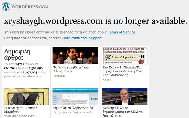 Εκτός λειτουργίας έθεσε ο παγκόσμιος ιστότοπος, WordPress.com τη σελίδα της «Χρυσής Αυγής», καθώς παραβιάζει τους όρους που διέπουν το συγκεκριμένο παγκόσμιο ιστολόγιο.