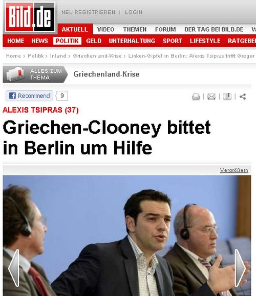 Μετά το γαλλικό Paris Match, και το πρωτοσέλιδο στον Guardian, ήρθε η σειρά της γερμανικής Bild να ασχοληθεί με τον πρόεδρο του ΣΥΡΙΖΑ, χαρακτηρίζοντάς τον ως τον «Έλληνα Κλούνεϊ, παρακαλάει το Βερολίνο για βοήθεια»!