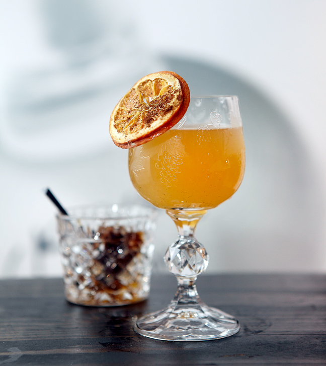Ανακινούμε όλα τα υλικά σε mixing glass και σερβίρουμε σε παγωμένο ποτήρι κρασιού. Γαρνίρουμε με αποξηραμένο πορτοκάλι πασπαλισμένο με γαρύφαλλο και κάρδαμο. Σερβίρουμε με ένα κομμάτι κυρήθρα δίπλα σε πιάτο.
