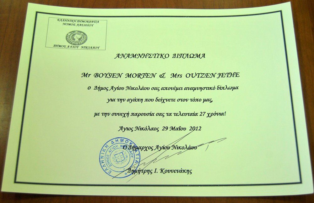 Ο δήμαρχος του Αγίου Νικολάου στο Λασίθι της Κρήτης τίμησε σήμερα ένα ζευγάρι δανών τουριστών που επισκέπτονται την πόλη συνεχώς τα τελευταία 27 χρόνια.