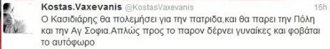 «Ο Κασιδιάρης θα πολεμήσει για την πατρίδα και θα πάρει την Πόλη και την Αγ. Σοφιά. Απλώς προς το παρόν δέρνει γυναίκες και φοβάται το αυτόφωρο» έγραψε χαρακτηριστικά.