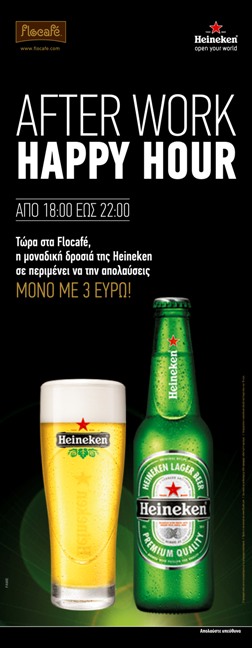 Τα Flocafé μαζί με τη μπίρα Heineken δημιουργούν το απόλυτο After Work Happy Hour και προσφέρουν καθημερινά στα καταστήματα Flocafé, από τις 18:00 έως τις 22:00 την μοναδική δροσιά της μπίρας Heineken μόνο με 3 ευρώ.