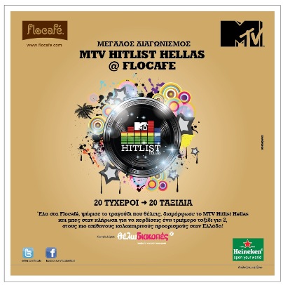 Η εμπειρία Flocafé επιφυλάσσει και άλλες όμορφες εκπλήξεις! Σε συνεργασία με το μεγαλύτερο ελληνικό μουσικό κανάλι MTV και τη δημοφιλή εκπομπή MTV HIT LIST, όσοι επισκέπτονται τα καταστήματα Flocafe θα έχουν τη δυνατότητα να διαμορφώσουν το MTV Hitlist Hellas Chart και να λάβουν μέρος σε κλήρωση για 20 τριήμερα πακέτα διαμονής στους πιο καλοκαιρινούς προορισμούς στην Ελλάδα. Μην χάσετε τα 16 feel good events που θα πραγματοποιηθούν με τη δυναμική συμμετοχή των VJs του MTV με δώρα διπλά εισιτήρια για τις πιο «καυτές» συναυλίες του καλοκαιριού!