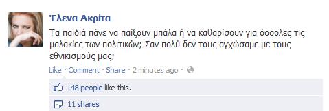 «Τα παιδιά πάνε να παίξουν μπάλα ή να καθαρίσουν για όοολες τις μ… των πολιτικών; Σαν πολύ δεν τους αγχώσαμε με τους εθνικισμούς μας;» έγραψε στο facebook.