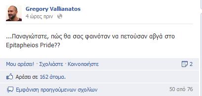 Αποκαλώντας την περιφορά του Επιταφίου Epitapheio Pride έγραψε στο facebook:«…Παναγιώτατε, πώς θα σας φαινόταν να πετούσαν αβγά στο Epitapheios Pride??»