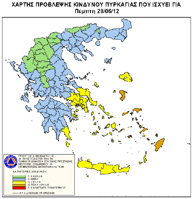 Σύμφωνα με τον Χάρτη Πρόβλεψης Κινδύνου Πυρκαγιάς που εκδίδει η Γενική Γραμματεία Πολιτικής Προστασίας του Υπουργείου Προστασίας του Πολίτη για σήμερα Πέμπτη 28 Ιουνίου 2012, προβλέπεται πολύ υψηλός κίνδυνος πυρκαγιάς (κατηγορία κινδύνου 4) για τις Περιφερειακές Ενότητες: