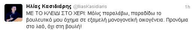 Τι θα το κάνει; «ΜΕ ΤΟ ΚΛΕΙΔΙ ΣΤΟ ΧΕΡΙ: Μόλις παραλάβω, παραδίδω το βουλευτικό μου όχημα σε εξαμελή μονογονεϊκή οικογένεια. Προνόμια στο λαό, όχι στη βουλή!». Αυτό έγραψε στο λογαριασμό του στο twitter ο Ηλίας Κασιδιάρης και μένει να δούμε κατά πόσο θα κάνει τα λόγια του πράξη…