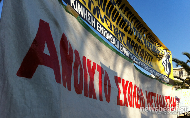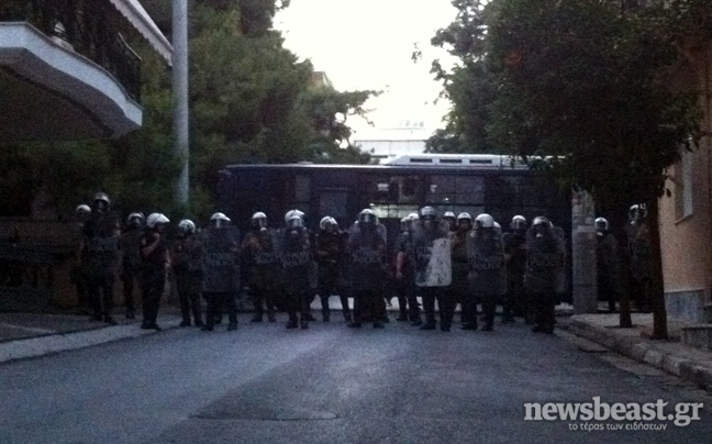 Η πορεία πραγματοποιείται συνοδεία αστυνομικών δυνάμεων, οι οποίες βρίσκονται εκεί για την αποφυγή επεισοδίων.