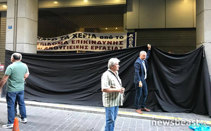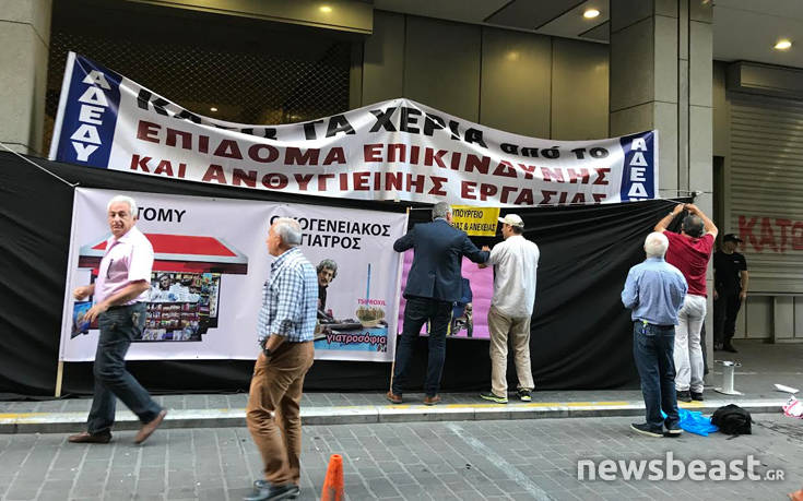 Αυτή την ώρα, και με τη στήριξη της ΑΔΕΔυ, έχουν υψώσει έξω από το υπουργείο πανό, στο οποίο, μεταξύ άλλων, απεικονίζεται ο αναπληρωτής υπουργός Υγείας να φτιάχνει γιατροσόφια «Τσιπροξιλ».