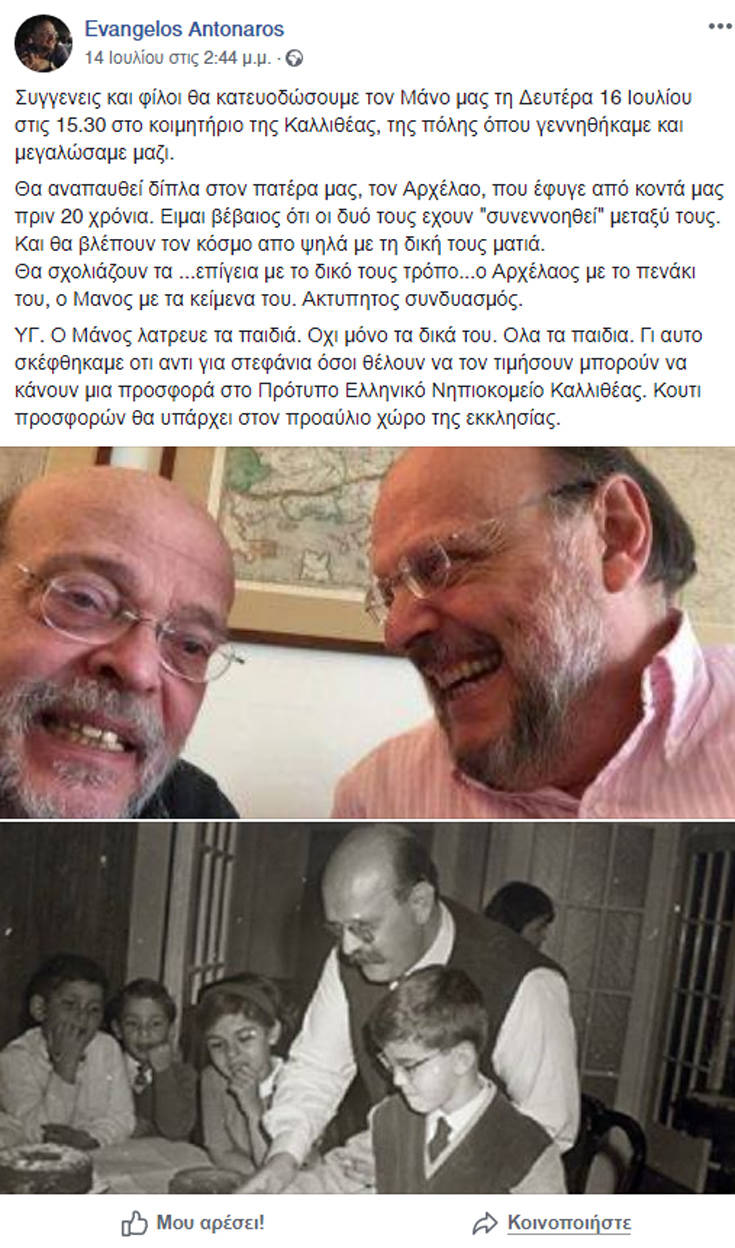 «Θα αναπαυθεί δίπλα στον πατέρα μας, τον Αρχέλαο, που έφυγε από κοντά μας πριν 20 χρόνια. Είμαι βέβαιος ότι οι δυο τους έχουν “συνεννοηθεί” μεταξύ τους. Και θα βλέπουν τον κόσμο από ψηλά με τη δική τους ματιά. Θα σχολιάζουν τα… επίγεια με το δικό τους τρόπο… Ο Αρχέλαος με το πενάκι του, ο Μάνος με τα κείμενα του. Ακτύπητος συνδυασμός» γράφει ο Ευάγγελος Αντώναρος.