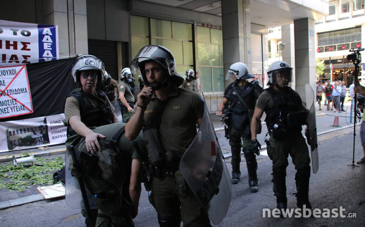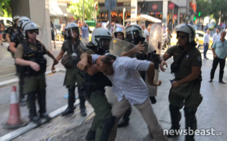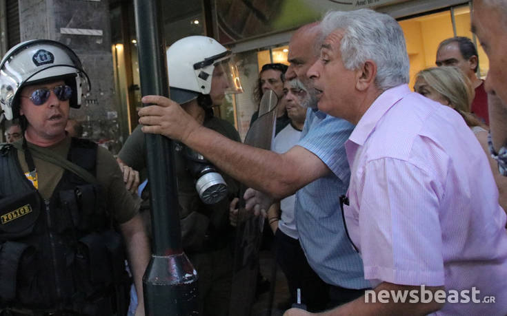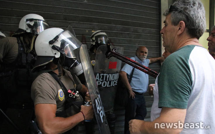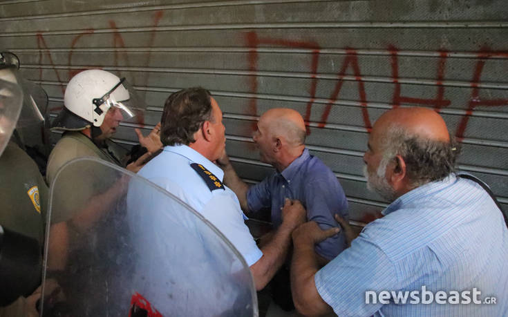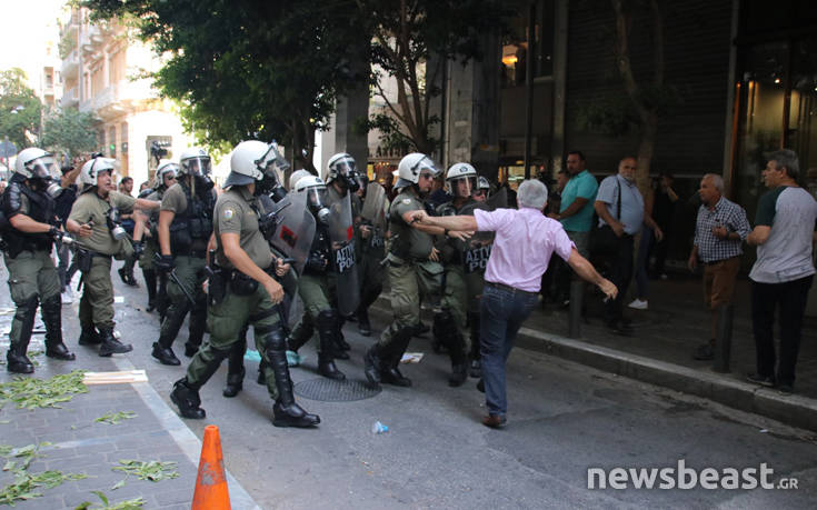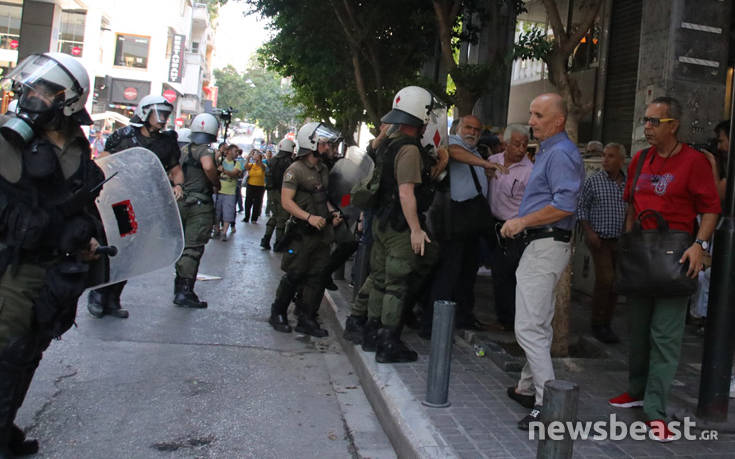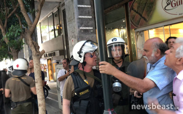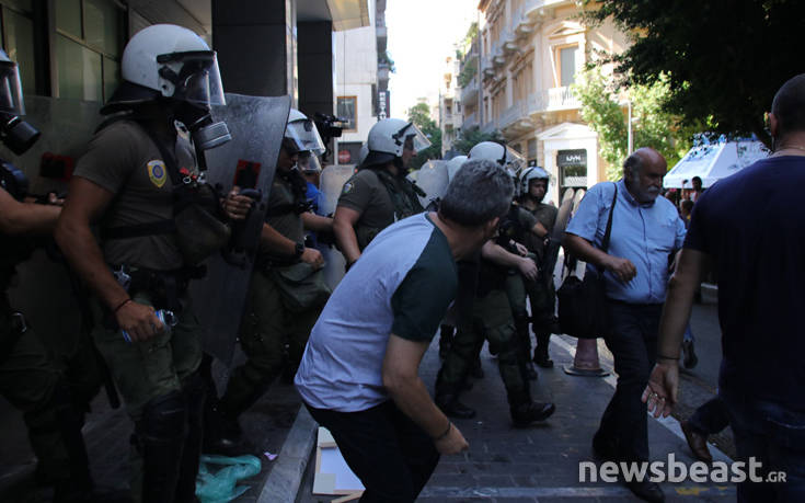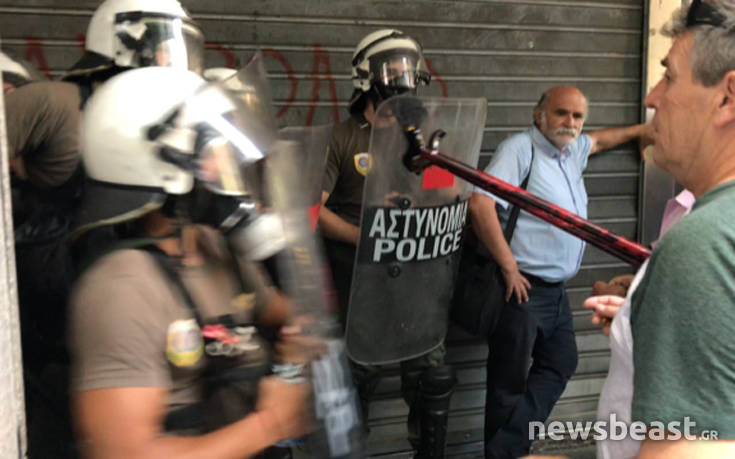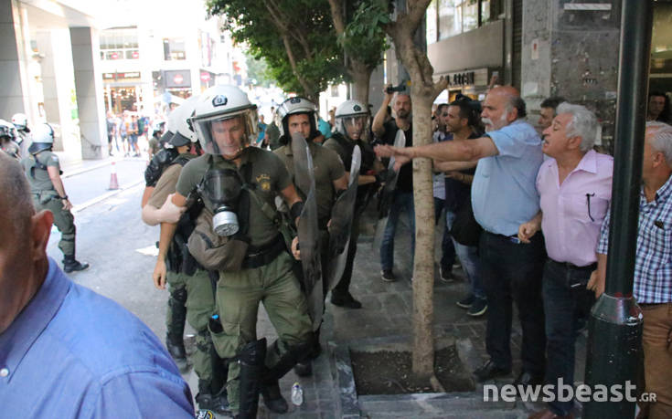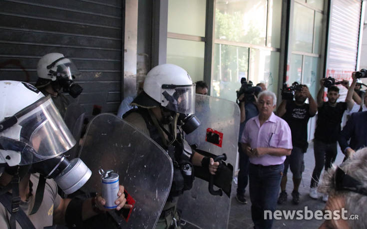Το γεγονός ότι ο πρόεδρος του σωματείου Εργαζομένων του υπουργείου Οικονομικών εμφανίστηκε στον χώρο, που πριν λίγη ώρα είχε επικρατήσει ένταση με χημικά, αυγά και «ιπτάμενα» βλήτα, στάθηκε… αφορμή για νέο γύρο επεισοδίων. Εκείνος ζήτησε οι διαδηλωτές να μπουν στο κτίριο, για να εκθέσουν τα αιτήματά τους σε κάποιον αρμόδιο, κάποια μέλη της ΠΟΕΔΗΝ επικρότησαν τη στάση του, επιχείρησαν μια κίνηση προς τα μέσα και τα επεισόδια δεν άργησαν. Οι δυνάμεις των ΜΑΤ για ακόμη μια φορά ενήργησαν έτσι, ώστε να μην εισέλθει κανείς μέσα στο υπουργείο και τα αίματα «άναψαν». Μάλιστα, οι αστυνομικοί περικύκλωσαν και έναν διαδηλωτή, αλλά τελικά τον άφησαν και δεν υπήρξε σύλληψη. Ωστόσο, το κλίμα έξω από το υπουργείο μυρίζει… μπαρούτι, με τους διαδηλωτές να εξακολουθούν να ζητούν συνάντηση με τον υπουργό, Ευκλείδη Τσακαλώτο, σχετικά με το θέμα των βαρέων και ανθυγιεινών και των επιτοκίων των στεγαστικών δανείων των δημοσίων υπαλλήλων. Δείτε βίντεο και φωτογραφίες του newsbeast.gr: