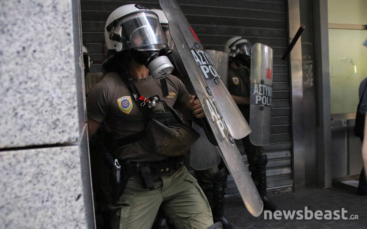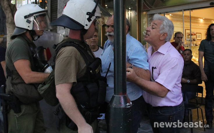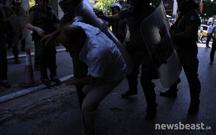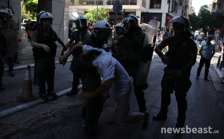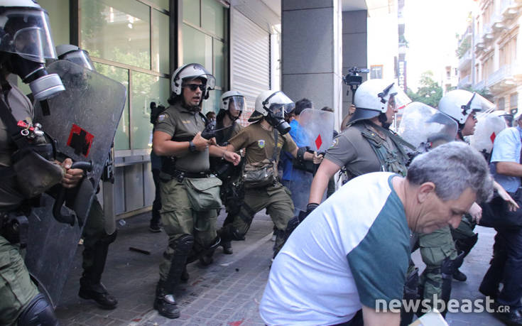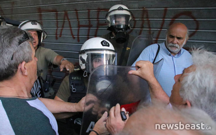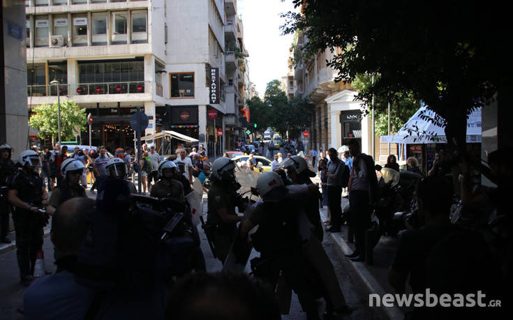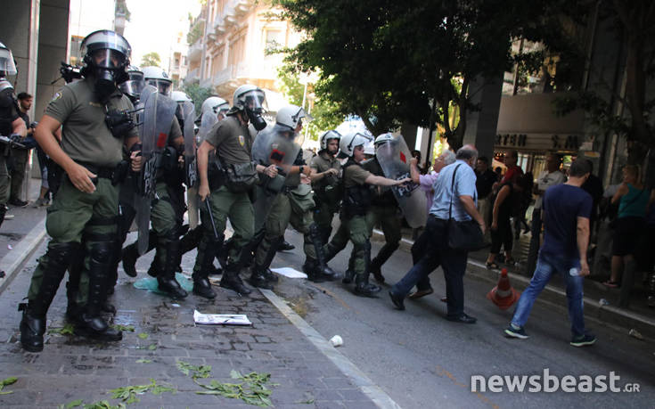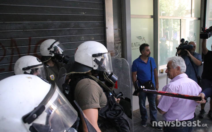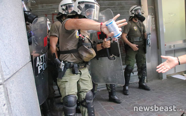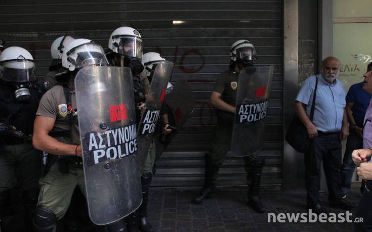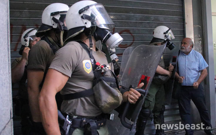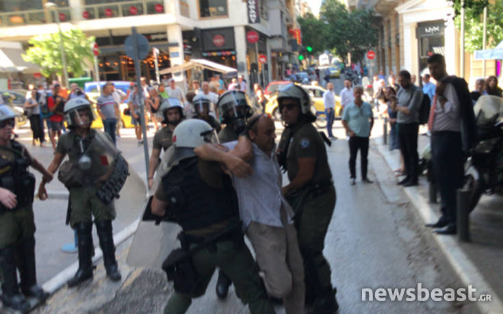 Το γεγονός ότι ο πρόεδρος του σωματείου Εργαζομένων του υπουργείου Οικονομικών εμφανίστηκε στον χώρο, που πριν λίγη ώρα είχε επικρατήσει ένταση με χημικά, αυγά και «ιπτάμενα» βλήτα, στάθηκε… αφορμή για νέο γύρο επεισοδίων. Εκείνος ζήτησε οι διαδηλωτές να μπουν στο κτίριο, για να εκθέσουν τα αιτήματά τους σε κάποιον αρμόδιο, κάποια μέλη της ΠΟΕΔΗΝ επικρότησαν τη στάση του, επιχείρησαν μια κίνηση προς τα μέσα και τα επεισόδια δεν άργησαν. Οι δυνάμεις των ΜΑΤ για ακόμη μια φορά ενήργησαν έτσι, ώστε να μην εισέλθει κανείς μέσα στο υπουργείο και τα αίματα «άναψαν». Μάλιστα, οι αστυνομικοί περικύκλωσαν και έναν διαδηλωτή, αλλά τελικά τον άφησαν και δεν υπήρξε σύλληψη. Ωστόσο, το κλίμα έξω από το υπουργείο μυρίζει… μπαρούτι, με τους διαδηλωτές να εξακολουθούν να ζητούν συνάντηση με τον υπουργό, Ευκλείδη Τσακαλώτο, σχετικά με το θέμα των βαρέων και ανθυγιεινών και των επιτοκίων των στεγαστικών δανείων των δημοσίων υπαλλήλων. Δείτε βίντεο και φωτογραφίες του newsbeast.gr: