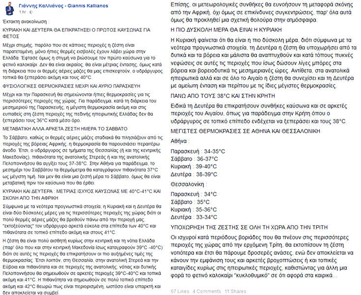 Δύσκολες αναμένονται να είναι η ερχόμενη Κυριακή και η Δευτέρα καθώς έρχεται ο πρώτος καύσωνας του φετινού καλοκαιριού, όπως προειδοποιεί ο μετεωρολόγος, Γιάννης Καλλιάνος με ανάρτησή του στο Facebook.