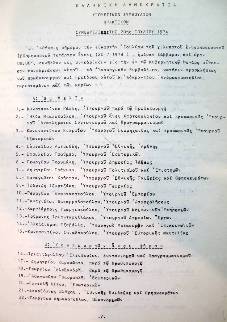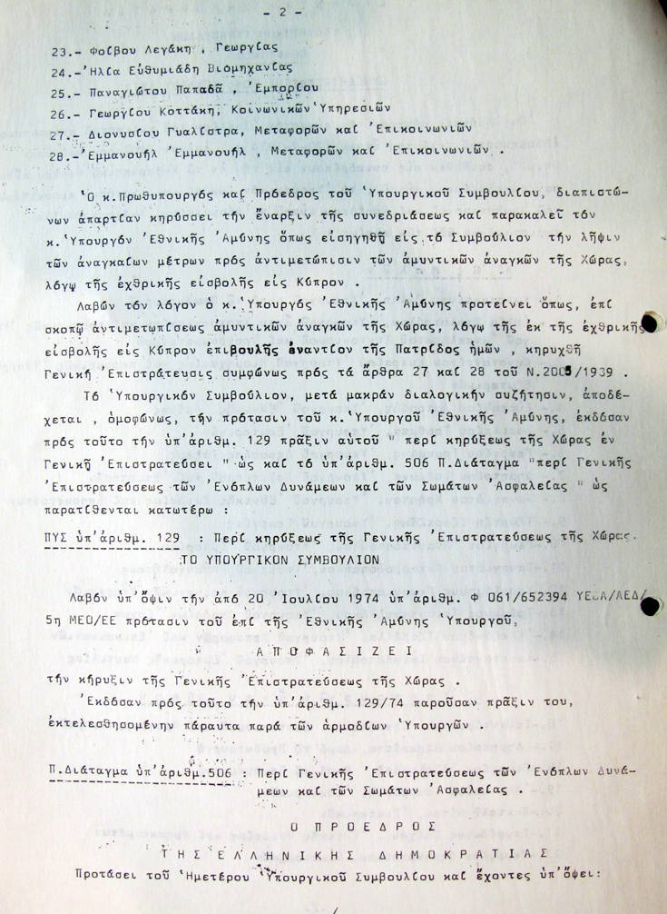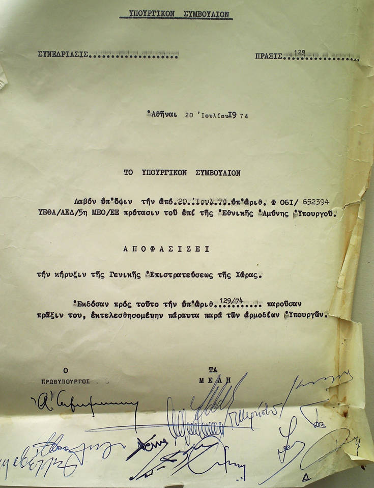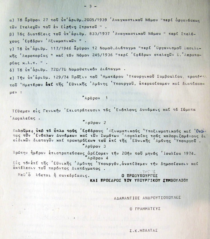 - Πρακτικά συνεδρίασης του Υπουργικού Συμβουλίου της 20ης Ιουλίου 1974 υπό τον Πρωθυπουργό Αδαμάντιο Ανδρουτσόπουλο, όπου αποφασίζεται η κήρυξη «της Γενικής Επιστρατεύσεως της χώρας» και Πράξη Υπουργικού Συμβουλίου με τις υπογραφές των συμμετεχόντων στο Υπουργικό Συμβούλιο.
