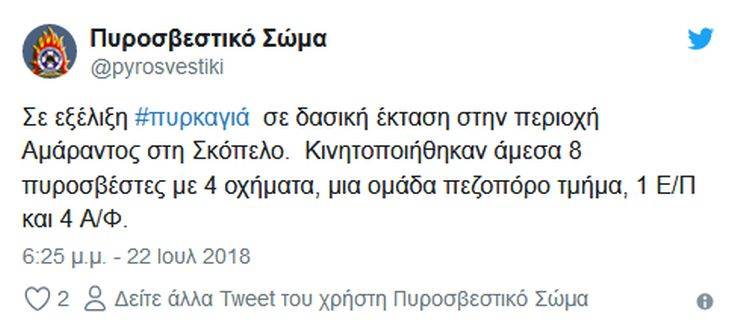 Έκταση με πεύκα κατακαίει μεγάλη πυρκαγιά που ξέσπασε το μεσημέρι της Κυριακής στον Αμάραντο του Αγνώντα Σκοπέλου.