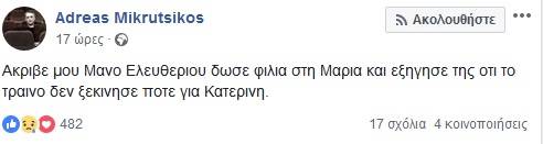 Το δικό του «αντίο» στον Μάνο Ελευθερίου θέλησε να πει ο Ανδρέας Μικρούτσικος. Ο παρουσιαστής που γνώριζε τον γνωστό στιχουργό και συγγραφέα έγραψε μέσα από τον λογαριασμό του στο Facebook. «Ακριβέ μου Μάνο Ελευθερίου δώσε φιλιά στη Μαρία και εξήγησε της ότι το τρένο δεν ξεκίνησε ποτέ για Κατερίνη».