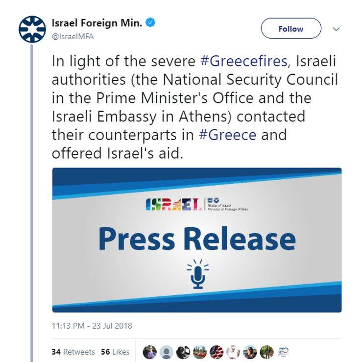 «Με δεδομένες τις σοβαρές πυρκαγιές στην Ελλάδα, οι ισραηλινές αρχές (το Συμβούλιο Εθνικής Ασφαλείας στο γραφείο του πρωθυπουργού και η ισραηλινή πρεσβεία στην Αθήνα) ήλθαν σε επαφή με τους ομολόγους τους στην Ελλάδα και πρόσφεραν την βοήθεια του Ισραήλ.