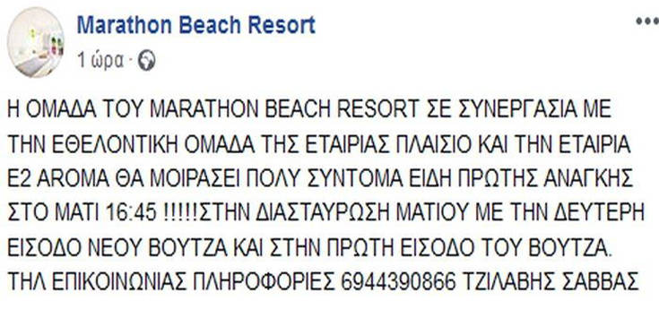Η ομάδα του MARATHON BEACH RESORT σε συνεργασία με την εθελοντική ομάδα της εταιρείας «ΠΛΑΙΣΙΟ» και την εταιρεία Ε2 AROMA μοιράζει από τις 16:45 είδη πρώτης ανάγκης στο Μάτι (στην διασταύρωση Ματιού με την δεύτερη είσοδο Νέου Βουτζά και στην πρώτη είσοδο του Βουτζά.