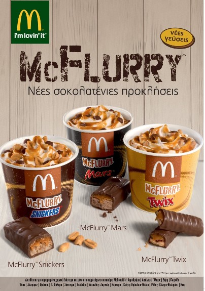 Η McDonald’s μας εκπλήσσει ευχάριστα για μία ακόμα φορά λανσάροντας τρεις νέες μοναδικές γεύσεις στο παγωτό McFlurry! Οι λάτρεις του αγαπημένου παγωτού McFlurry μπορούν από τις 16 Ιουλίου να απολαμβάνουν εκτός από τις γεύσεις SMARTIES και KIT KAT και τις τρεις νέες υπέροχες γεύσεις TWIX, SNICKERS και MARS ζώντας στιγμές μοναδικής απόλαυσης.