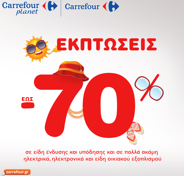 Λίγο πριν την καλύτερη περίοδο της χρονιάς και την έναρξη των αποδράσεων για τους περισσότερους Έλληνες, η Carrefour Μαρινόπουλος ρίχνει τις τιμές κατά 70% σε είδη ένδυσης και υπόδησης αλλά και σε πολλά ηλεκτρικά, ηλεκτρονικά και είδη εξοπλισμού για το εξοχικό και όχι μόνο.