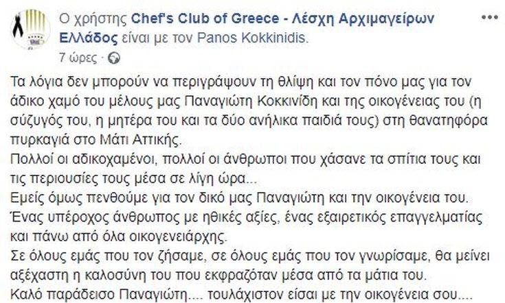 Τη θλίψη της για τον θάνατο του Παναγιώτη Κοκκινίδη και της οικογένειάς του εξέφρασε η Λέσχη Αρχιμαγείρων Ελλάδος, που σε ανάρτησή της στο Facebook αναφέρει: