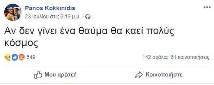 Μάλιστα, ο Παναγιώτης Κοκκινίδης, σε μία ανάρτηση στο Facebook που πλέον μοιάζει προφητική και μακάβρια, είχε γράψει το μεσημέρι της Δευτέρας, βλέποντας από μακριά τις φλόγες: «Αν δεν γίνει ένα θαύμα θα καεί πολύς κόσμος».