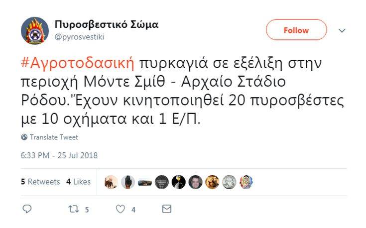 Σε εξέλιξη βρίσκεται αυτήν την ώρα πυρκαγιά σε αγροτοδασική έκταση στην περιοχή Μόντε Σμίθ – Αρχαίο Στάδιο Ρόδου, όπως ανακοίνωσε η Πυροσβεστική.
