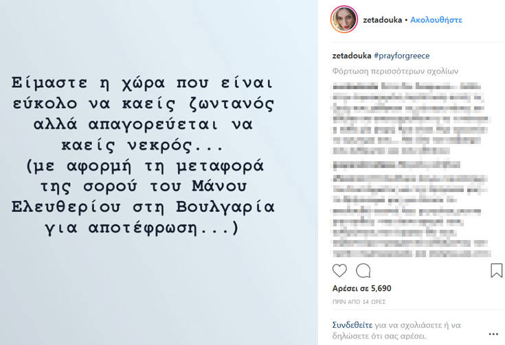 Με ένα σχόλιό της, με το οποίο τάσσεται υπέρ της αποτέφρωσης νεκρών, αναφέρθηκε στην πολύνεκρη τραγωδία που βιώνει η χώρα τα τελευταία 24ωρα, με τους δεκάδες νεκρούς από τις φωτιές στην Αττική, αλλά και στον θάνατο του σπουδαίου Μάνου Ελευθερίου. Ο σπουδαίος δημιουργός άφησε την τελευταία του πνοή τα ξημερώματα της Κυριακής και η σορός του μεταφέρθηκε στη Βουλγαρία για αποτέφρωση. Η Ζέτα Δούκα έκανε μία ανάρτηση στο Instagram: «Είμαστε η χώρα που είναι εύκολο να καείς ζωντανός αλλά απαγορεύεται να καείς νεκρός».