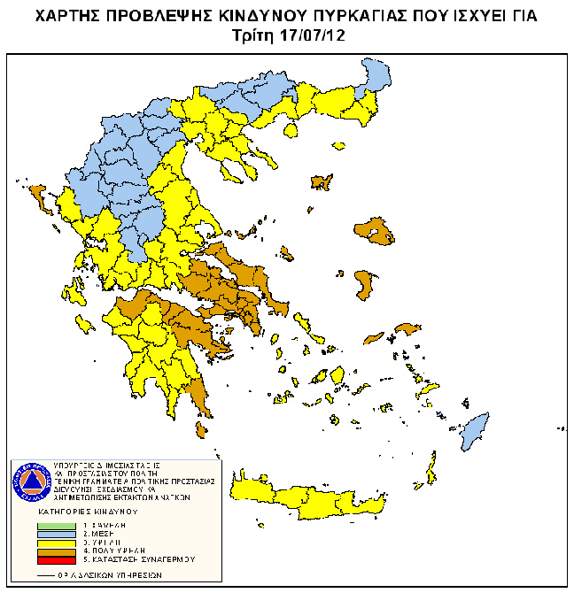 Σύμφωνα με τον Χάρτη Πρόβλεψης Κινδύνου Πυρκαγιάς που εκδίδει η Γενική Γραμματεία Πολιτικής Προστασίας για σήμερα προβλέπεται πολύ υψηλός κίνδυνος πυρκαγιάς (κατηγορία κινδύνου 4) για τις Περιφερειακές Ενότητες: