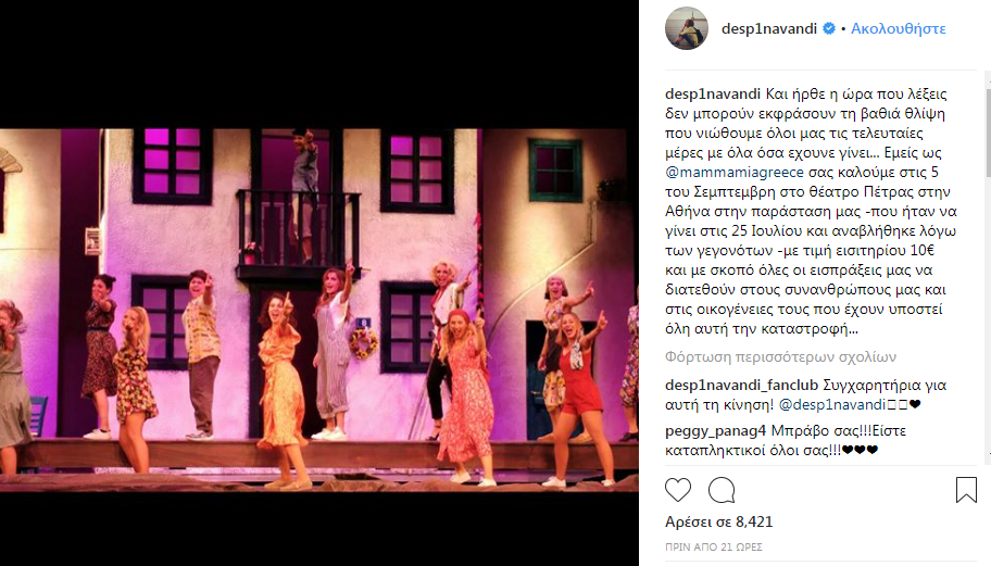 Κανείς δεν έχει μείνει ασυγκίνητος και άπραγος μπροστά στην ανείπωτη τραγωδία, που ξετυλίγεται από την περασμένη Δευτέρα, στην Αττική. Ο καθένας από το δικό του μετερίζι και με όποια μέσα και τρόπους μπορεί, στέκεται στο πλευρό των πυρόπληκτων στο Μάτι. Από τον απλό κόσμο, μέχρι και τους «επώνυμους»…. Είναι εκεί για να προσφέρουν τη βοήθεια και συμπαράστασή τους, στους συνανθρώπους τους. Ανάμεσα σε αυτούς και η Δέσποινα Βανδή, η οποία ανακοίνωσε στο κοινό, μέσα από τα social media ότι η θεατρική παράσταση «Mamma Mia», που ήταν να γίνει στις 25 Ιουλίου στο θέατρο Πέτρας, θα πραγματοποιηθεί τελικά, στις 5 Σεπτεμβρίου. Μάλιστα, τα έσοδα της παράστασης θα διατεθούν όλα για την ανακούφιση των πυρόπληκτων, στο Μάτι. Την ανακοίνωση, η γνωστή τραγουδίστρια τη συνόδευσε με ένα συγκινητικό μήνυμα, για όσα συμβαίνουν τις τελευταίες ημέρες. «Και ήρθε η ώρα που λέξεις δεν μπορούν εκφράσουν τη βαθιά θλίψη που νιώθουμε όλοι μας τις τελευταίες μέρες με όλα όσα έχουνε γίνει… Εμείς ως @mammamiagreece σας καλούμε στις 5 του Σεπτέμβρη στο θέατρο Πέτρας στην Αθήνα στην παράσταση μας -που ήταν να γίνει στις 25 Ιουλίου και αναβλήθηκε λόγω των γεγονότων -με τιμή εισιτηρίου 10€ και με σκοπό όλες οι εισπράξεις μας να διατεθούν στους συνανθρώπους μας και στις οικογένειες τους που έχουν υποστεί όλη αυτή την καταστροφή…», έγραψε χαρακτηριστικά, στον προσωπικό της λογαριασμό, στο Instagram.