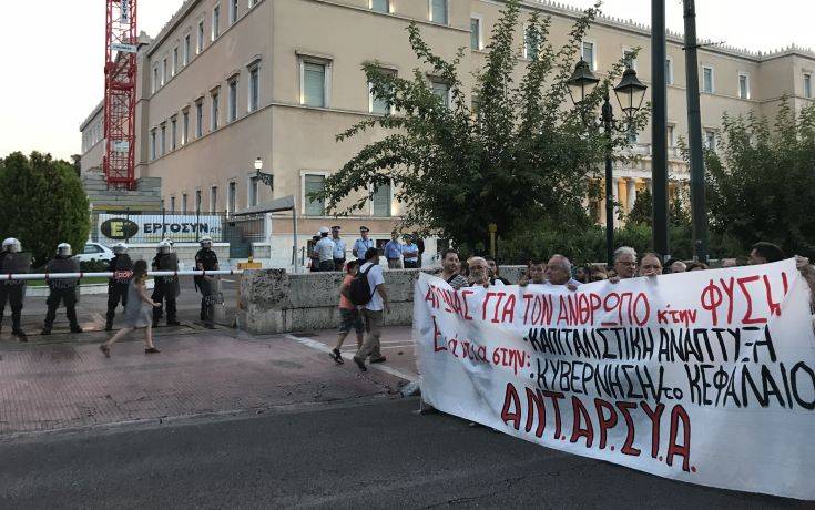 Οι διαδηλωτές κρατούσαν πανό με συνθήματα κατά της κυβέρνησης, διαμαρτυρόμενοι για τους νεκρούς από τις πυρκαγιές στην ανατολική Αττική.