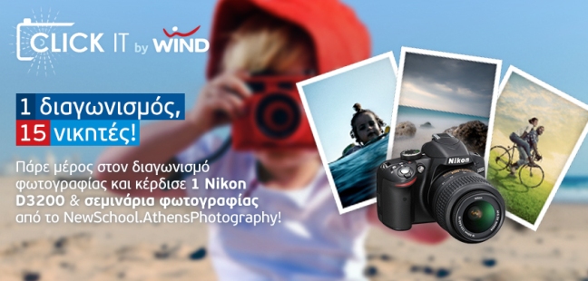 Αμέτρητες εικόνες, ένας διαγωνισμός,15 νικητές και απίθανα δώρα θα προκύψουν από το διαγωνισμό φωτογραφίας «Click it» που διοργανώνει η WIND, σε συνεργασία με το NewSchool.AthensPhotography για την αναζήτηση νέων φωτογραφικών ταλέντων. Οι καλύτερες φωτογραφίες θα «δώσουν» το δικό τους χρώμα στο site της WIND.