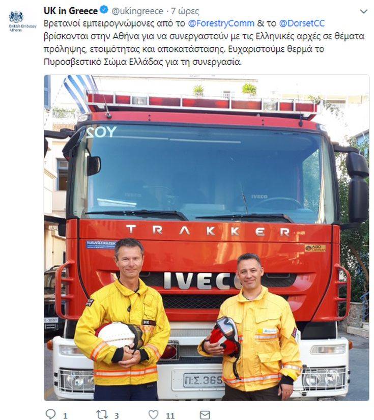 Δύο Βρετανοί εμπειρογνώμονες, εξειδικευμένοι σε θέματα πρόληψης, ετοιμότητας και αποκατάστασης πυρκαγιών, βρίσκονται αυτή την εβδομάδα στην Αθήνα προκειμένου να συνεργαστούν με τις ελληνικές αρχές στον απόηχο των καταστροφικών πυρκαγιών που έπληξαν την Αττική, αναφέρεται στο tweet της βρετανικής πρεσβείας στην Αθήνα.