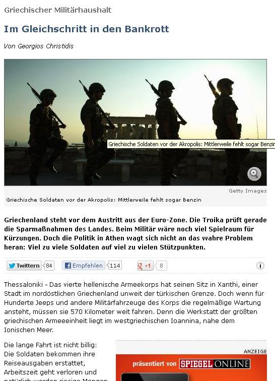«Η Ελλάδα είναι ένα βήμα πριν από την έξοδο από την Ευρωζώνη, η τρόικα εξετάζει τα μέτρα λιτότητας της χώρας. Στον ελληνικό στρατό υπάρχουν ακόμα μεγάλα περιθώρια για περικοπές αλλά οι Έλληνες πολιτικοί δεν τολμούν να αγγίξουν το πραγματικό πρόβλημα: υπάρχουν πάρα πολλοί στρατιωτικοί σε πάρα πολλά στρατόπεδα», γράφει στην αρχή του άρθρου το περιοδικό αποκαλύπτοντας στους τη «μαύρη τρύπα» που διοχετεύεται στις ένοπλες δυνάμεις.